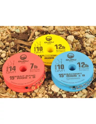 De Guru 15″ Bayonets QM1 Ready Rigs zijn ontwikkeld voor de visserij met een leadclip of voor gebruik met een normale Cagefeeder/voerkorf. Deze 38 cm lange onderlijn is geknoopt van Guru N-gauge en is voorzien van een Bayonet welke perfect te gebruiken is voor het vissen met mini boilie’s of imitatie aassoorten. De onderlijn is geknoopt met 1 van de meest gebruikte haken in de wedstrijdwereld namelijk de Guru QM1. De onderlijnen worden geleverd op Eva Foam Spools welke perfect passen in de Guru Rigbox, door de kleur codering grijp je nooit mis en heb je meteen de juiste spoel bij de hand.